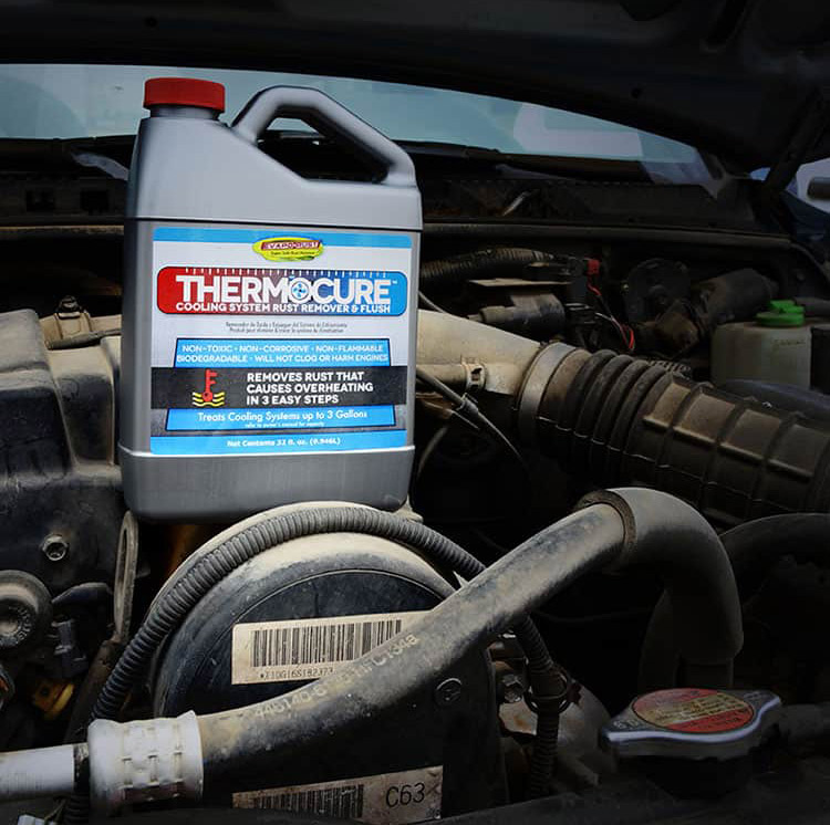 Treat the overheat with Evapo-Rust® THERMOCURE®. THERMOCURE® Cooling System Rust Remover & Flush uses the latest technology in rust and corrosion removal to completely revitalize any water cooled engine. THERMOCURE® removes rust scale and deposits from radiators, water pumps, water jackets, engine blocks, and heads. Rust and corrosion act an insulator and cause vehicles to overheat. THERMOCURE® clears away that rust and restores your cooling system to normal working condition. THERMOCURE® cooling system flush is safe, simple, and easy to use. This product restores the engine’s ability to transfer heat to the coolant allowing engines to run cooler and essentially last longer!